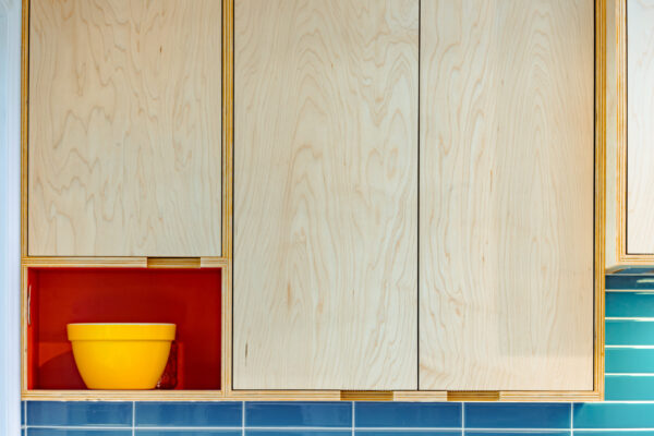 FRENCHPLACE Project Overview These custom kitchen cabinets are crafted from high-quality maple plywood, showcasing the beauty of clean joinery by leaving the edges exposed. The modern, flat-panel doors and drawer fronts highlight the subtle grain of the maple, while the negative pulls create a clean, distraction free front surface. Bright laminate accents bring playful color…